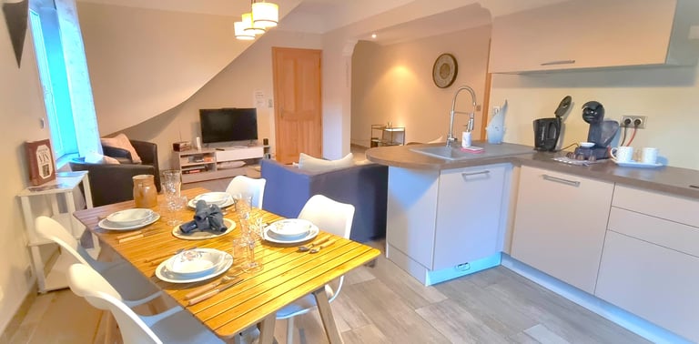 Situé dans un cadre idyllique, cet appartement spacieux de 200 m² est idéal pour accueillir votre groupe ou votre famille. Avec ses six chambres, dont une magnifique suite avec balcon, chaque invité pourra profiter d'un confort optimal grâce aux grands lits de 160 cm, qui peuvent être facilement séparés en deux lits simples. L’appartement dispose de trois toilettes et trois salles de bains, offrant ainsi une grande commodité. La cuisine séparée est entièrement équipée avec des appareils modernes, y compris une machine à café Dolce Gusto et une machine à bière, tandis qu'une grande table dans la pièce à vivre invite à partager des repas conviviaux. Pour les moments de détente, un billard et un jeu de fléchettes sont à votre disposition. De plus, le linge de lit et de toilette est fourni, assurant un séjour sans souci. C'est l'endroit parfait pour passer des vacances inoubliables.